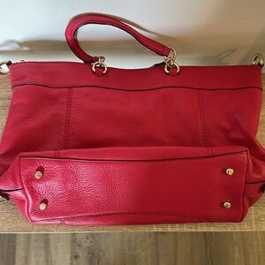 Like new leather Coach tote with crossbody strap. Bag is 16” wide by 9” high. Excellent condition.