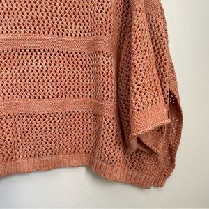 This Universal Thread sweater in a soft orange hue with pops of pink and brown features a cozy crew neck design and a relaxed fit, perfect for a comfortable yet stylish look. The sweater's unique knit pattern combines denser and more open sections, adding texture and visual interest. Its voluminous sleeves are designed to be worn scrunched up, creating a chic, billowy effect.