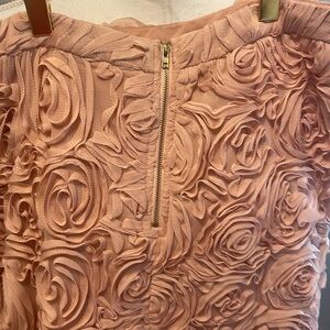 This skirt is gorgeous! Bought from online boutique. Brand is Soieblu. It is a size Large(runs very small…I was a size 12 when I bought this, and it ran more like an 8 or 10). The skirt does have a short zipper in the back at the top(shown in one of the photos). It is lined. The 3D rosette pattern is an attention getter. Comes from a smoke free home. Be sure to check out my other items…many boutique brands & lots still with tags!