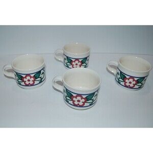 Set of 4 Pfaltzgraff Arbor Vine coffee / tea mugs featuring a red flower, green leaf & vines with a blue border. No cracks or crazing but there is a small chip on one cup near the bottom (see photos). These vintage original mugs are perfect for adding a touch of elegance to your kitchen or dining area.