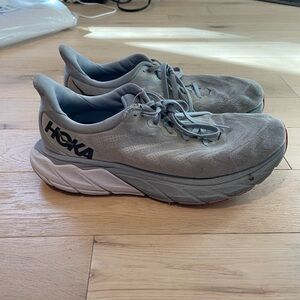 HOKA ARAHI 6. Light blue/grey, orange, and white. These have been well loved and do show wear in tear. Super comfy.