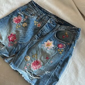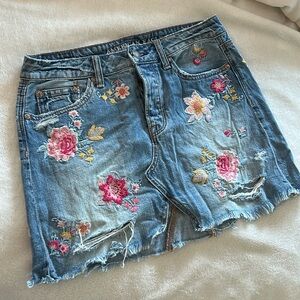 This American Eagle denim jean skirt features beautiful flower embroidery. It's stylish and perfect for casual wear, adding a touch of charm to any outfit. In excellent condition.