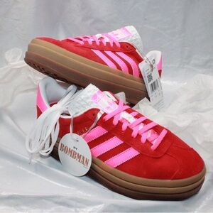 The Adidas Gazelle Bold Collegiate Red / Lucid Pink brings a bold update to the iconic Gazelle silhouette. This sneaker features a rich Collegiate Red suede upper and stays true to its heritage while making a statement. Lucid Pink accents on the 3-Stripes, heel tab, and laces add a vibrant contrast, while the triple-stacked gum sole fades from light to dark for a unique touch. Embossed Adidas branding and a Lucid Pink tongue tag complete the design. Classic yet modern, this Gazelle Bold is a must-have for sneaker lovers looking to stand out.