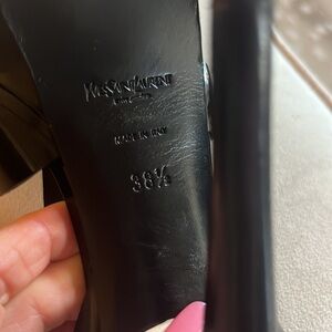 Beautiful black patent shoes, perfect for any festive occasion. They have an adjustable ankle strap, made from calfskin leather, and are a size EU 38 1/2, or a size 8.5 in US measure. Heel height is 105mm(5.25 inches), with a platform height of 25mm(1.2 inches). They are in good condition with minimal wear and 1 small nick on the left heel that was professionally repaired.