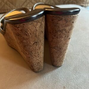 Beautiful cork and calfskin leather sandals in a rare platinum leather color. These have a metal plate on the front with the Jimmy Choo name . Back of wedge measures 4.5 inches with a platform of 1.5 inches. They are a size 8(38) and show minimal signs of wear on the cork or the leather.