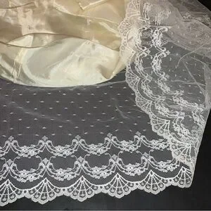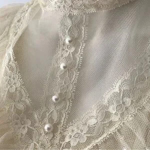Sheer Swiss dot bishop lace sleeves, elastic cuff gathering with long lace cuff and pearl & loop button closure