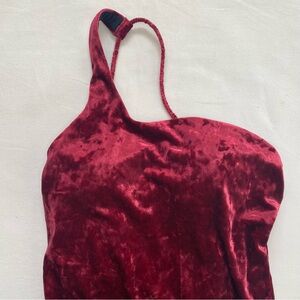 Soft stretchy velvet. Removable pads. One shoulder. Tied in back. Burgundy, maroon color