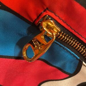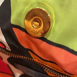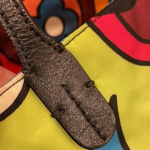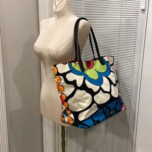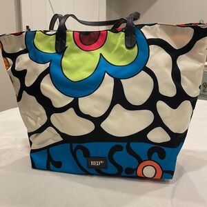 Vibrant tote bag featuring a bold pattern with black handles. Perfect for adding a pop of color to any outfit.