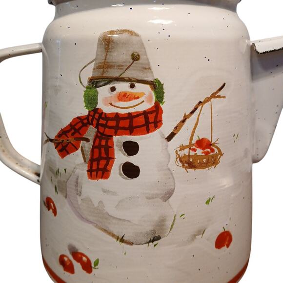 Hallmark White Enamelware Snowman Christmas Decor Stovetop Coffee Pot Mitford