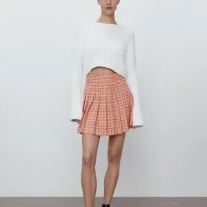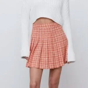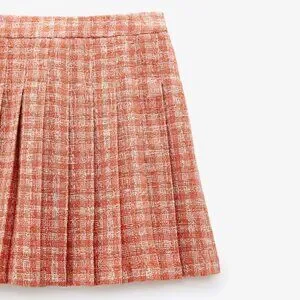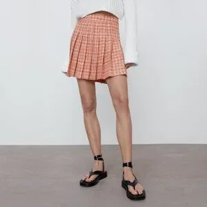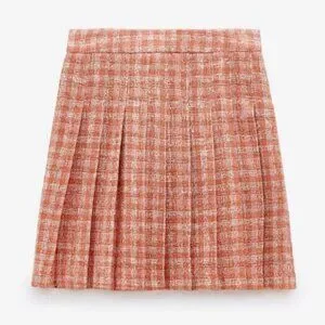Beautiful and stylish, the Zara Tweed Plaid Pleated Mini Skirt is high-waisted with a structured box pleats design. The orange and white add a pop of colour and modern look, while the plaid pattern gives a classic look. Its timeless design makes it perfect for year-round fashion, pairing beautifully with T-shirts, knits, blouses, cardigans, cami, jacket—you name it. Simple and timeless.