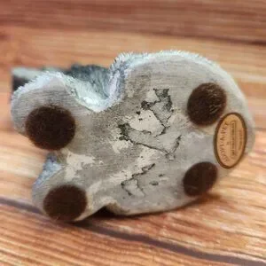 It has some chips on the bottom of the right side near the feet. Some spots on the back as well. Another small spot on the left foot.