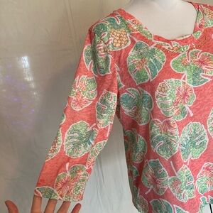 Hearts of Palm tropical print blouse embellished neck coral lime pineapple large