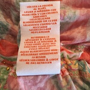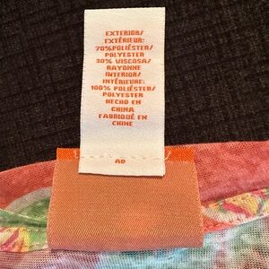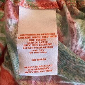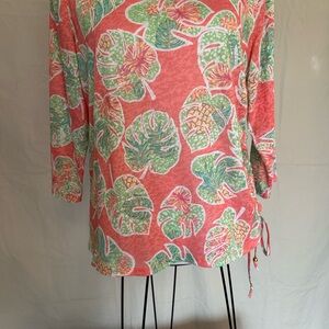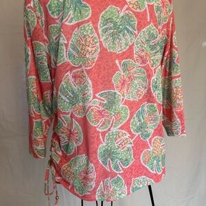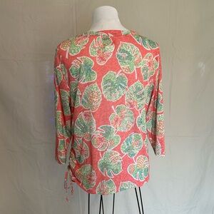 Adorable blouse from Hearts of Palm featuring a coral ginger colored background with lime green palm leaves and pineapples. Decorative neckline with gold embellishments. Elbow length sleeves. Ruching along left side seam with adjustable drawstring. Size large. Lightweight semi-sheer fabric, which is very soft to the touch and does have some stretch to it, 70% polyester, 30% rayon. (It appears there was an undershirt at one time, but do not have this garment.) Good used condition.