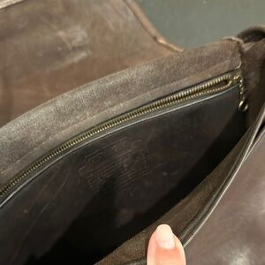 This awesome rare coach shoulder bag features a rich brown leather with a classic shape and a long adjustable strap with brass buckles and coach hang tag. The flap closure and metal hardware add a touch of vintage charm, while the soft, worn texture enhances its timeless appeal.