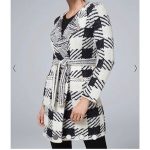 White House Black Market black & white long sweater coat. Tue waist. Accent pockets with bottom. Classic style. New with tags. Size large