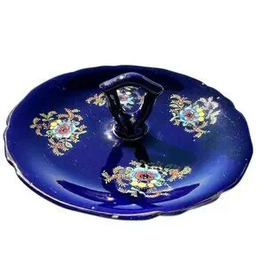 Add a touch of vintage charm to your home w/ this stunning cobalt blue porcelain handled serving tray, beautifully adorned w/ hand-painted floral enamel and gold accents. This Made in Japan piece is perfect for serving desserts, cookies, finger foods, or as a decorative statement piece. The deep blue glaze adds a regal touch, making it a great addition to vintage or antique kitchenware collections.