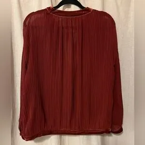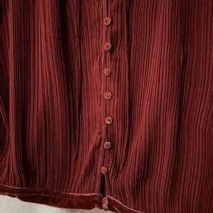 Elegant burgundy blouse with button-up front. Features a pleated design and velvet trim.
