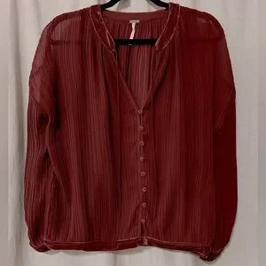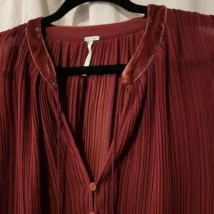 Free People Pleated Chiffon with Velvet Details Button-Up Blouse