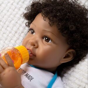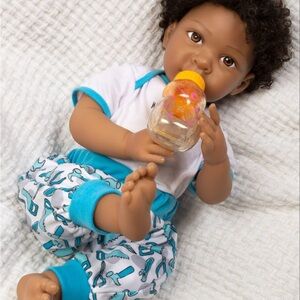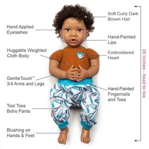 Adorable baby doll with a tool-themed outfit. Includes a bib and toy hammer. Features vibrant colors.