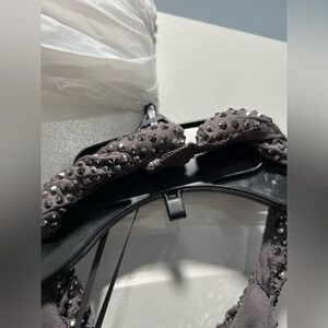 Ponte jersey crystal embellished halter gown. Features knotted detail at waist and front slit. Available in Charcoal.