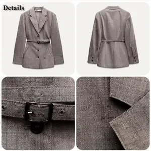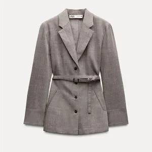 ZARA WOMAN COLLECTION Blazer made of 100% wool. Notched lapel collar and long sleeves. Front welt pockets. Adjustable self-belt with metal buckle. Front button closure.