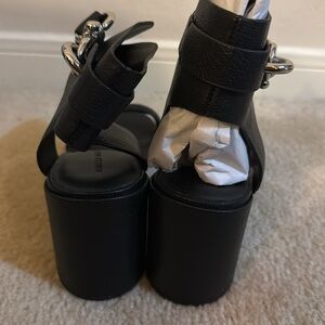 Brand new, never worn Rebecca Minkoff Malina ankle strap heeled sandal with silver clasp. Size 9.5, black leather upper. Purchased new from boutique and never worn.