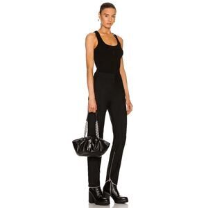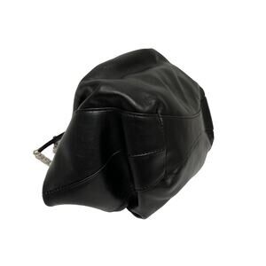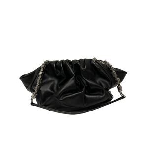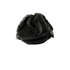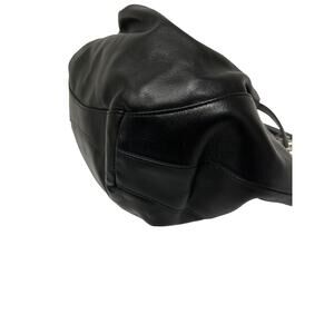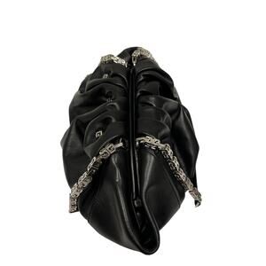 This GIVENCHY Black Leather Silver Lock Accent Chain Strap Kenny Shoulder Bag exudes modern sophistication. Crafted from supple black leather, its elegantly gathered silhouette balances style and practicality. Featuring a bold silver chain strap with geometric links and a signature silver lock, this statement piece adds a refined yet edgy touch to any ensemble.