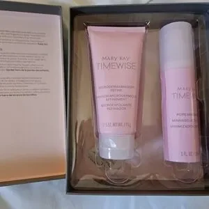Mary Kay Timewise skincare set with microdermabrasion refine and pore minimizer. Elegant pink packaging.