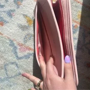Stylish pink pouch with bold red lettering. Perfect for organizing essentials. Gently used