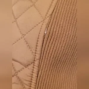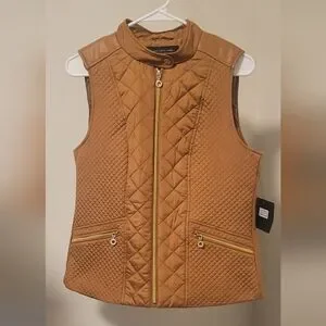 Stay stylish and warm with the Marc New York Women's Quilted Vest. This tan vest features a chic quilted design, faux leather accents, and a touch gold(zippers) for a little pop. It's perfect for layering in cooler weather and light enough for springtime, too.