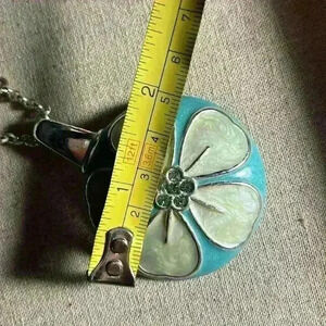 Beautiful enamel pendant and earrings. Lovely greens and silver. Necklace has lighter aqua colored rhinestones while the earrings have more of a teal color rhinestone. Chain measures 15” plus a 3” extender. So charming! Includes a handmade, chunky stone 19” necklace.
