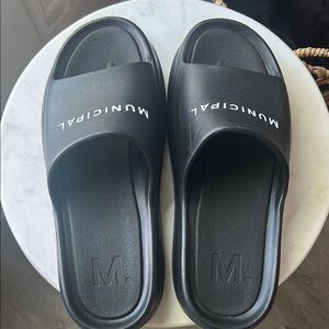 Comfortable black slide sandals with Municipal branding. Perfect for casual wear. Only worn 2 times, with no signs of any wear.