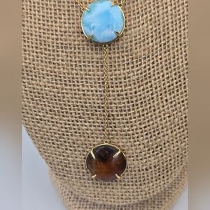 Faux Larimar Tigers Eye Round Double Pendant Goldtone Lariat Necklace