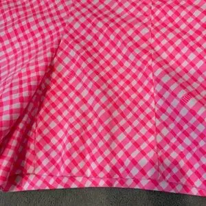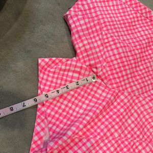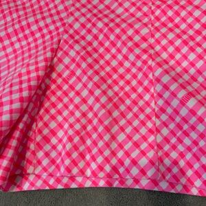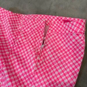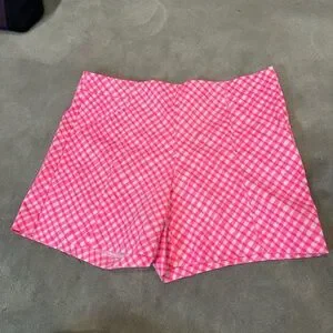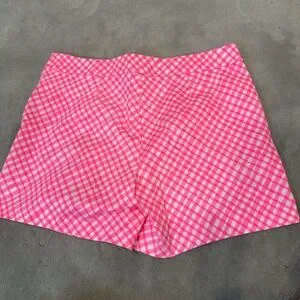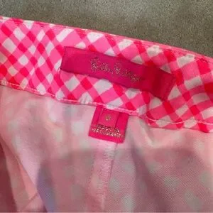 These high-waisted shorts from Lilly Pulitzer feature a vibrant pink and white checkered pattern, offering a playful and stylish look. Crafted from lightweight fabric, they provide comfort and ease, making them perfect for warm weather activities. Side zipper. In very good condition.