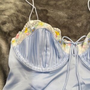 For Love & Lemons Paloma Slip Mini Dress In Blue. Defined by pleated cups and intricate floral embroidery, this silky slip has ethereal charm. Delicate bow details and a peekaboo keyhole back complete the the piece. FOR LOVE & LEMONS FOR VICTORIA’S SECRET: An exclusive collaboration that blends dreamy confidence with thoughtful detailing, giving each piece a unique and feminine feel.