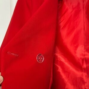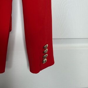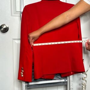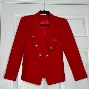 This vibrant red blazer features a structured design with a tailored fit, perfect for adding a touch of sophistication to any outfit. Crafted from a smooth, textured fabric, it offers a classic look with modern appeal.