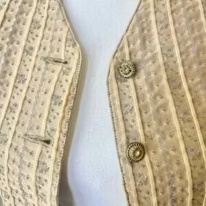 Excellent condition! This tan vest has light purple flowers embroidered throughout and four gold/bronze buttons in front. It is lined in tan fabric.
