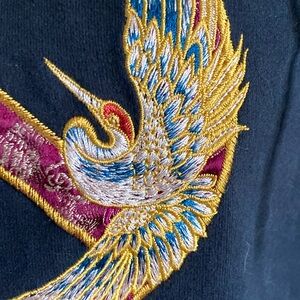 Stylish black hoodie featuring vibrant Asian style embroidery and a large peace symbol. Perfect for casual wear.