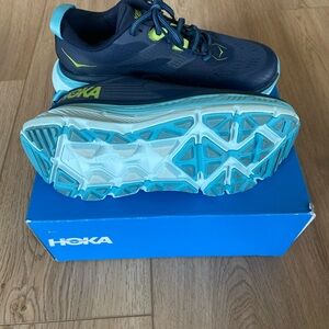 Hoka One One Stinson ATR 6 shoes in blue and black. Ideal for running.