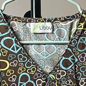 Charming high-low scrub top with heart and peace sign pattern, featuring a drawstring in back that will cinch your waist, and a mix of blue, green, and brown on a brown base. Ideal for healthcare settings. No Size Tag available.