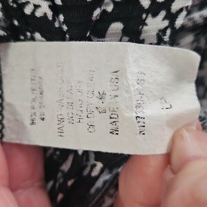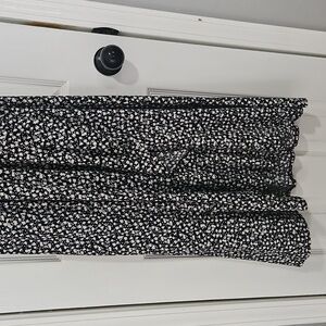 BEAUTIFUL AND VERY FLATTERING EXCELLENT CONDITION BLACK AND WHITE FLORAL PRINT SHORT SLEEVE PETITE MAXI DRESS WITH CROSSOVER FRONT AT BUST FAUX WRAP STYLE HI LOW HEMLINE FROM THE RACONTEUR SIZE LARGE PETITE.
