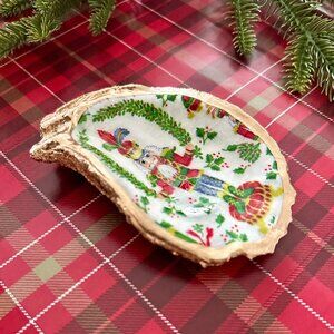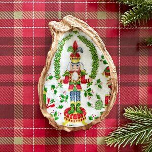 Beautifully handcrafted, this large oyster shell dish with a nutcracker design will add one-of-a-kind charm to your holiday decor. Made from real oyster shell handpicked from the beaches of coastal South Carolina. Decoupaged and trimmed in classic gold with a smooth finish. Decorate any table or vanity, uniquely showcase your favorite jewelry pieces, or share this gift with a special friend or family member. Size: Approx. 4.75"L x 3.25"W.
