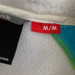 Retro 80s Colorblock Fleece Lined Medium Weight Ski Shell Jacket. White with Multicolor Shoulder and Hood - Diagonal Stripe Arm and Chest. Full Zip - Zip Pockets - Spyder Logo Bottom and Back. Size Medium. Spot on hood and back shoulder noted in photo. Warm - Hiking - Ski.