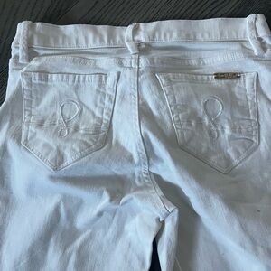 Stylish white jeans featuring elegant blue embroidery. Perfect for a chic and modern look.