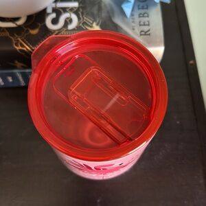 Used once and somewhat dusty from just sitting in storage. Adorable pink stainless steel wine thermos. Removable plastic lid that has a sliding portion that you can drink out of or you can put a straw into. Flamingo picture featured on one side. Hand wash only.