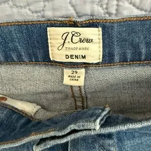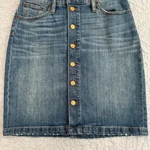 Jcrew denim skirt with rose gold buttons down the front and back pockets. The skirt hem has minimal distressing . Gently worn in very good condition . Medium wash , size 29.