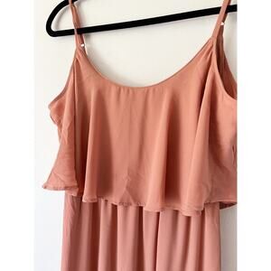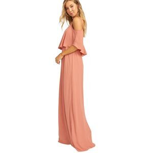 NWOT Show Me Your Mumu Caitlyn Ruffle Maxi Dress Rustic Mauve Crisp Pink Dress. This versatile piece is long and flowing, with adjustable spaghetti straps and ruffle around the chest. No slits and fully lined with the ability to wear it with your arms out for the classic ruffle style or you can put your arms through making it a more cold shoulder style dress. This dress also has a hidden elastic waistband to help everything stay in place.