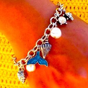 A vibrant ocean-inspired bracelet showcases an enchanting array of silver seashells in diverse sizes and textures, complemented by lustrous white baroque pearls. A captivating sea flower charm adorned with a gleaming white gem and a shimmering mermaid tail featuring mesmerizing blue swirls gracefully sway from a silver link chain, embodying the whimsical essence of the sea. Adjustable clasp closure for a perfect fit.