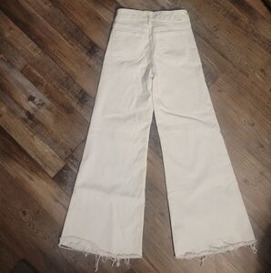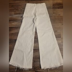Stylish Mother white wide-leg jeans, perfect for any occasion. Enjoy a comfortable fit with a trendy frayed hem.