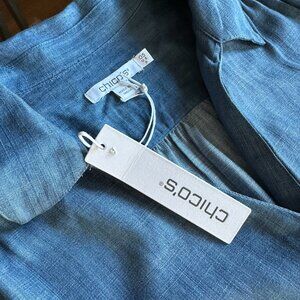 Chico's Chambray Tencel Tiered Maxi Sundress. Women's size .5 (US 6). New with tag. Tiered ruffle sleeves, Eyelet hem. Pockets. Perfect transitional spring dress. Smoke-free home.